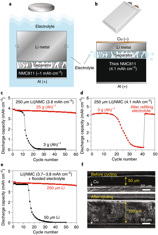 我們平時(shí)研究Li金屬電極時(shí)使用了成倍過(guò)量的鋰金屬和電解液,所得大多數研究結果中不能被放大應用到實(shí)際的軟包電池中。對于以往研究的大多數可充放電扣式電池,其能量密度遠小于50Wh/kg。如圖2所示,關(guān)鍵電池參數,包括正極負載,電解液量和Li金屬量(厚度)都對電池循環(huán)性能有重要影響。除了其他非活性材料(如隔膜,集流體和包裝材料)外,還必須仔細選擇這些參數,以獲得長(cháng)循環(huán)高能實(shí)用電池。圖2:電池參數和電池壽命與Li負極形態(tài)之間的關(guān)系。a,實(shí)驗室扣式電池經(jīng)常使用成倍過(guò)量的Li和電解液。b,具有多層堆疊電極的高能軟包電池。c-e,具有不同電解液用量(c)的Li || NMC電池的循環(huán)性能,在原始貧電解液被消耗(d)之后補充電解液,電池的循環(huán)性能;不同厚度Li金屬(e)的Li || NMC電池的循環(huán)性能。紅色線(xiàn)代表軟包電池,黑色線(xiàn)代表扣式電池。f,循環(huán)后,Li金屬負極的厚度變化,開(kāi)始采用的是厚度為50微米的Li。用于c-e的扣式電池在C/10倍率下循環(huán)2次進(jìn)行化成,然后在2.7-4.4V的電壓范圍內以C/3倍率循環(huán)進(jìn)行充放電循環(huán)。